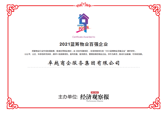 卓越商企服務(wù)斬獲2021多項榮譽,獲得“2021藍籌物業(yè)百強企業(yè)”、“2021卓越投資價值企業(yè)”兩項大獎,卓越商企服務(wù)集團有限公司執(zhí)行董事兼總經(jīng)理郭瑩榮獲“2021年度領(lǐng)軍人物”稱號,并成功入圍RICS Awards China 2021 “年度設(shè)施管理團隊”獎項