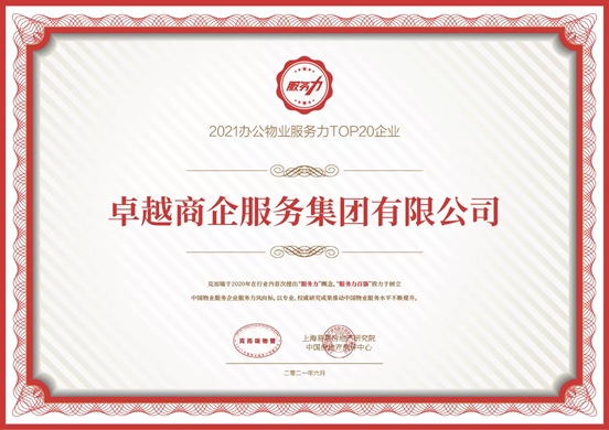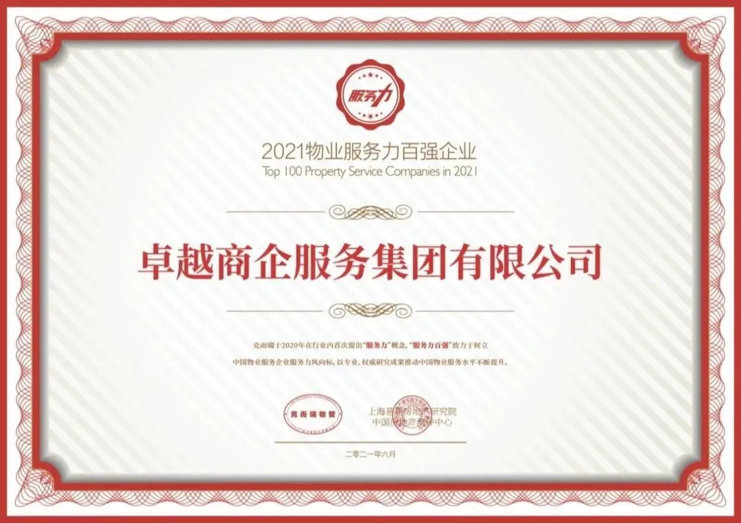 成功入圍百強企業(yè),卓越商企服務(wù)榮獲“2021中國物業(yè)服務(wù)企業(yè)服務(wù)力百強企業(yè)”、“2021中國辦公物業(yè)服務(wù)力20強企業(yè)(TOP3)稱號。