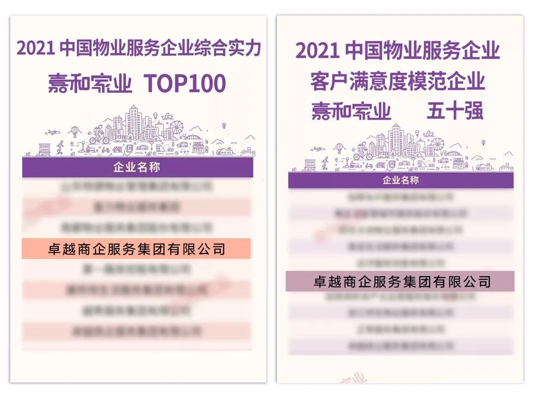 值得慶賀的是,在前不久發(fā)布的億翰智庫(kù)“2021中國(guó)物業(yè)服務(wù)企業(yè)綜合實(shí)力研究成果“上,卓越商企服務(wù)更是憑借優(yōu)異的財(cái)務(wù)表現(xiàn)和客戶口碑,榮登“2021中國(guó)物業(yè)服務(wù)企業(yè)綜合實(shí)力百?gòu)?qiáng)企業(yè)”、“2021中國(guó)物業(yè)服務(wù)企業(yè)客戶滿意度模范企業(yè)50強(qiáng)”、“2021中國(guó)物業(yè)服務(wù)企業(yè)商業(yè)物業(yè)服務(wù)十強(qiáng)”、“2021中國(guó)物業(yè)服務(wù)企業(yè)單坪創(chuàng)收十強(qiáng)”。