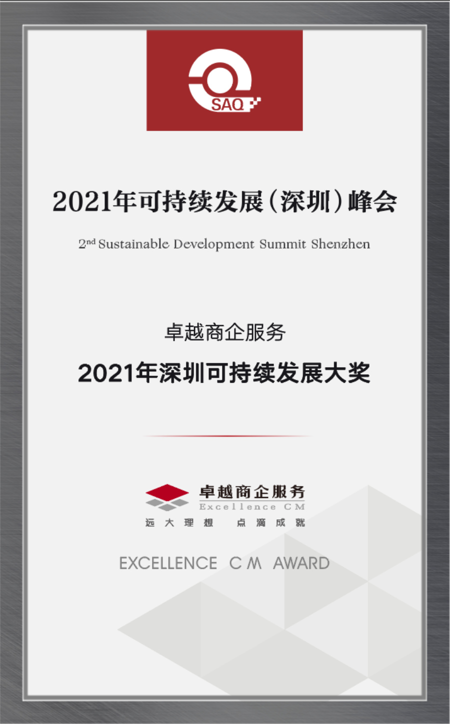 本次峰會上,卓越商企服務(股票代碼:6989.HK)憑借科學完善的可持續(xù)發(fā)展經營能力、樓宇綠色低碳管理實踐,從眾多參評的知名企業(yè)中脫穎而出,榮膺“2021深圳可持續(xù)發(fā)展大獎(經濟類)”,再一次證明了卓越商企服務在高質量發(fā)展的同時,遵循ESG企業(yè)可持續(xù)發(fā)展思路,長期以來在綠色物業(yè)、能源管理、環(huán)境管理、企業(yè)社會責任及可持續(xù)發(fā)展方面的卓越表現,同時也體現了政府、社會組織各界專家、領導對卓越商企服務在引領行業(yè),打造城市可持續(xù)發(fā)展、綠色低碳運營方面寄予的厚望。
