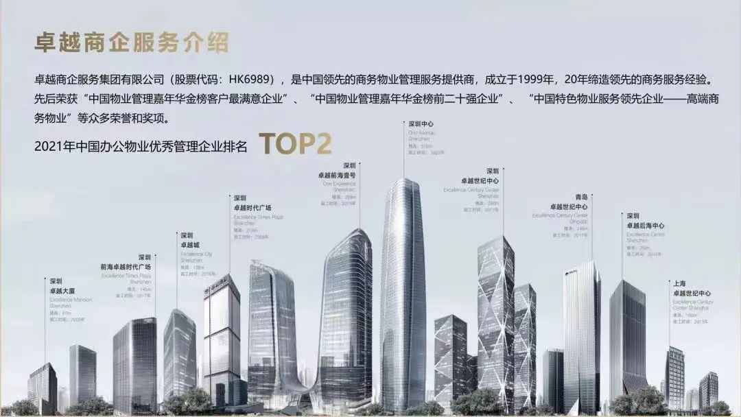 作為“中國領(lǐng)先的商務(wù)物業(yè)服務(wù)提供商”,卓越商企服務(wù)歷經(jīng)二十載匠心灌注,深耕商務(wù)物業(yè)服務(wù)領(lǐng)域。