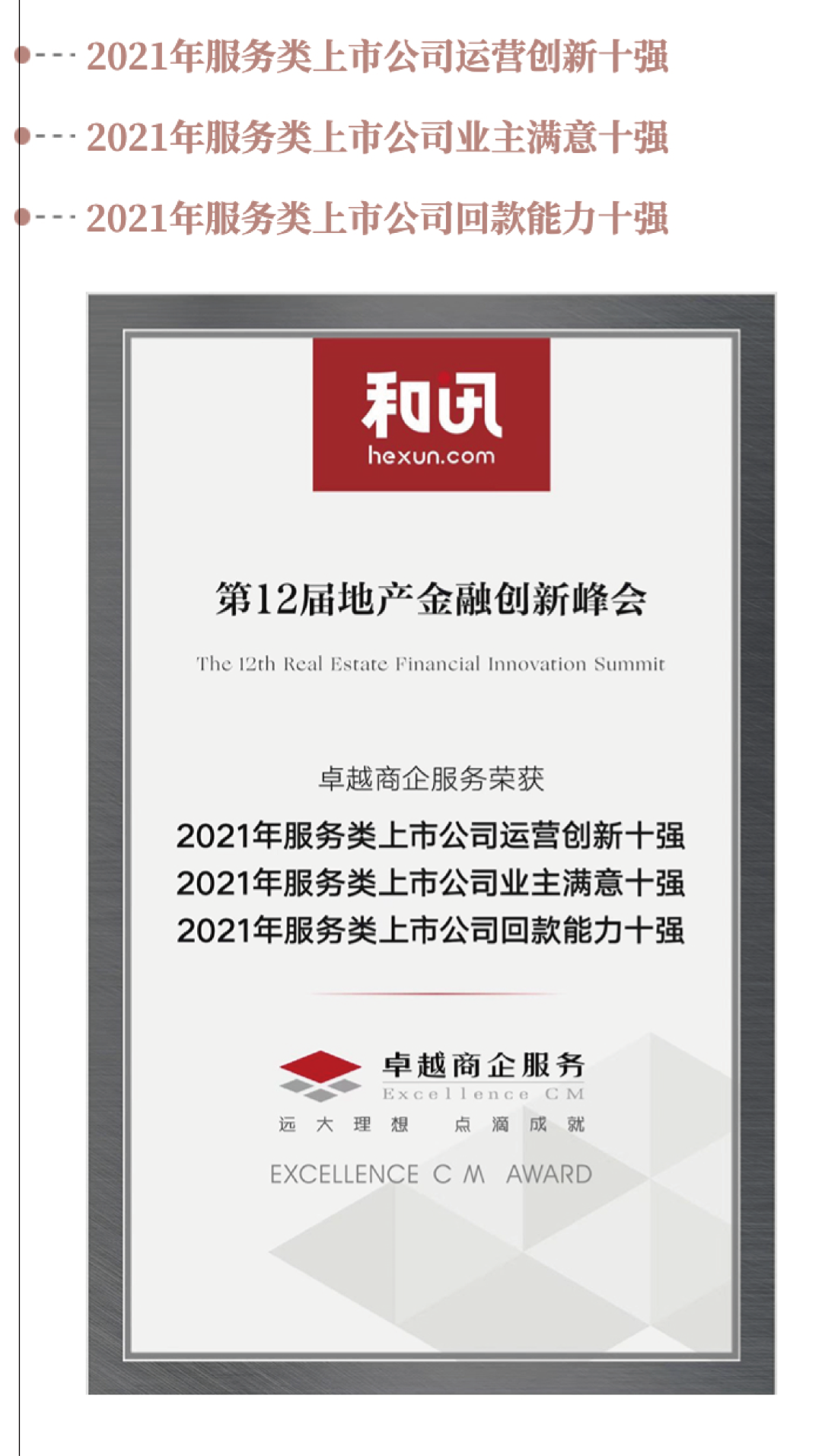 穩(wěn)健經(jīng)營可持續(xù),蓄勢賦能向未來。上市兩周年,卓越商企服務(wù)已然站在了新的起跑線上,堅(jiān)持長期主義,堅(jiān)持以終為始;仍將以更加堅(jiān)定信心的姿態(tài),面向未來,穩(wěn)步推進(jìn)業(yè)務(wù)規(guī)模的有效增長;堅(jiān)持?jǐn)?shù)字化創(chuàng)新來提升管理效率和客戶體驗(yàn),打造實(shí)實(shí)在在的核心能力;堅(jiān)定人才建設(shè),持續(xù)打造有戰(zhàn)斗力的團(tuán)隊(duì),穩(wěn)扎穩(wěn)打,在每個(gè)運(yùn)營環(huán)節(jié)上下深功夫,厚積薄發(fā)。憑借全生命周期全鏈條綜合服務(wù)能力,持續(xù)鞏固在中國商務(wù)物業(yè)服務(wù)提供商中的領(lǐng)先地位。