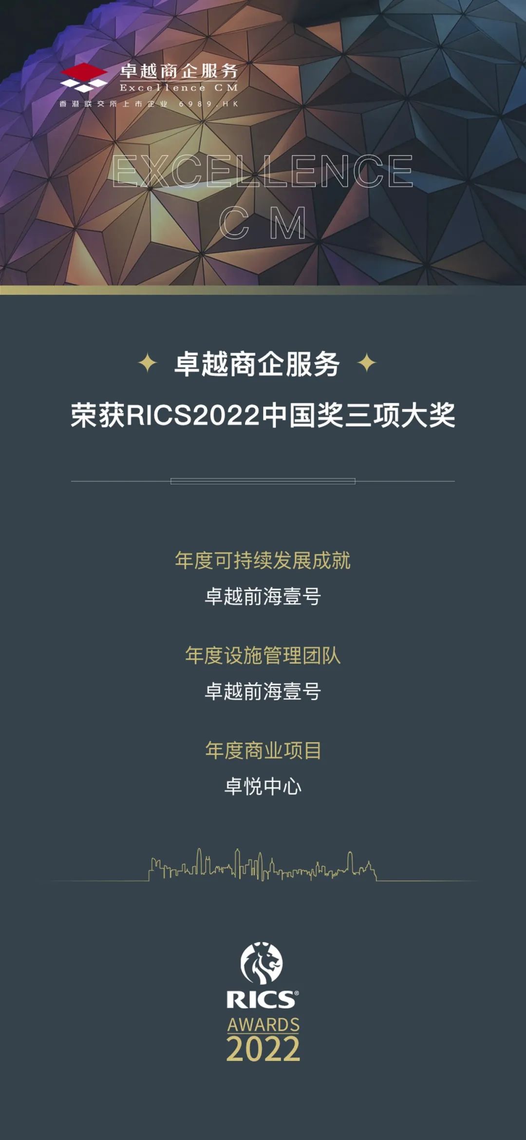 近日,由皇家特許測量師學(xué)會(RICS)主辦的RICS中國峰會暨RICS中國頒獎典禮圓滿落幕。RICS Awards被公認(rèn)為房地產(chǎn)和建筑行業(yè)「奧斯卡」,在全球行業(yè)內(nèi)極具影響力。卓越商企服務(wù)集團(tuán)(港股上市代碼:6989.HK)作為中國領(lǐng)先的商務(wù)物業(yè)管理服務(wù)提供商,此次所申報的三個項(xiàng)目全部獲得RICS中國獎年度大獎。