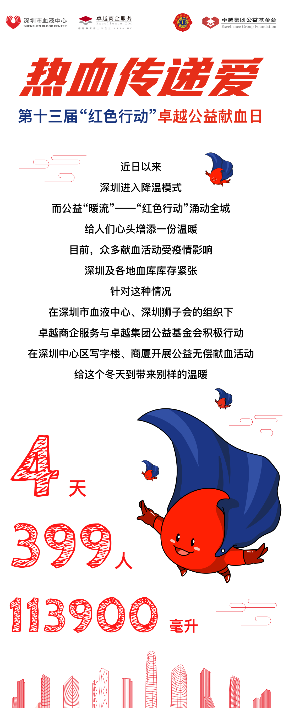 由深圳市血液中心、深圳獅子會(huì)、卓越集團(tuán)公益基金會(huì)聯(lián)動(dòng)卓越商企服務(wù)集團(tuán)(港股代碼:6989.HK)通力合作下舉辦的第十三屆“紅色行動(dòng)”卓越公益獻(xiàn)血日活動(dòng)于2022年10月31日-11月3日分別在卓越城一期、卓越城二期、卓越世紀(jì)中心、卓越時(shí)代廣場(chǎng)成功舉辦。深圳市血液中心獻(xiàn)血服務(wù)部副部長(zhǎng)藍(lán)欲曉、深圳獅子會(huì)中心區(qū)服務(wù)隊(duì)等眾多愛(ài)心人士蒞臨現(xiàn)場(chǎng)親自為大家服務(wù)。「紅色行動(dòng)」吸引了眾多心懷大愛(ài)的熱血英雄無(wú)償獻(xiàn)血,挽袖英雄們的無(wú)私奉獻(xiàn),傳遞著生命的希望,用點(diǎn)滴善行,共筑生命希望。