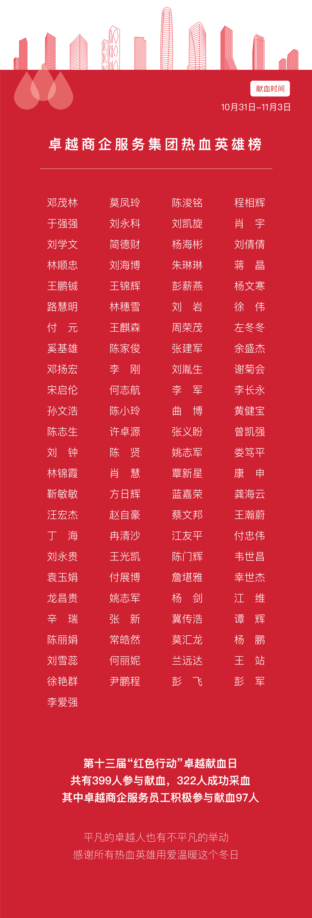 更值得一提的是,在今年的無(wú)償獻(xiàn)血活動(dòng)中,來(lái)自卓越商企服務(wù)的熱血英雄多達(dá)97人,他們中有COE和總部職能的小伙伴、有項(xiàng)目上的安全員兄弟和工程師傅、有漂亮的禮賓小姐姐和帥氣的禮賓小哥,有特地從其他項(xiàng)目趕來(lái)的保潔大叔、也有初入職場(chǎng)的新翼管培生......他們當(dāng)中有多次參與無(wú)償獻(xiàn)血的“獻(xiàn)血達(dá)人”,也有初次參加的“獻(xiàn)血勇士”,他們中每一位都是來(lái)自卓越的熱血英雄。