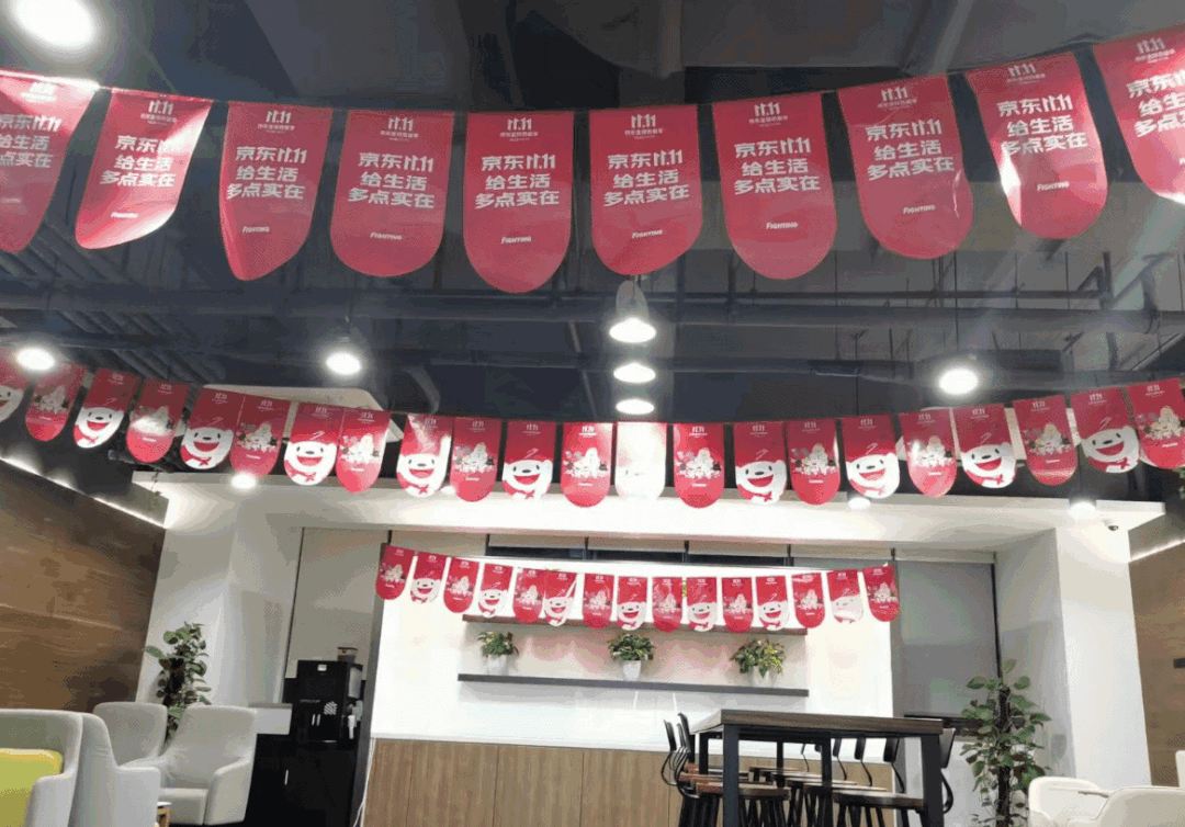上海寶山京東職場項(xiàng)目團(tuán)隊(duì)協(xié)助客戶懸掛吊旗橫幅以及對聯(lián)粘貼等,助力客戶雙十一大促再創(chuàng)佳績。