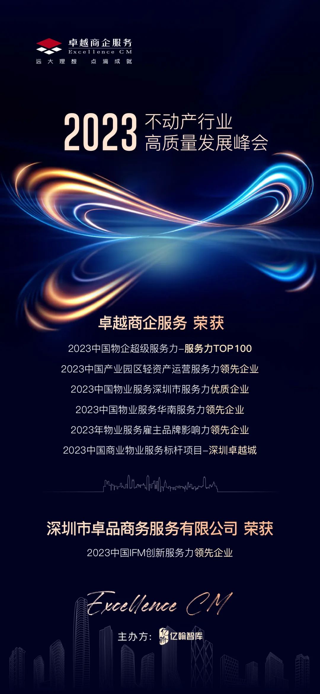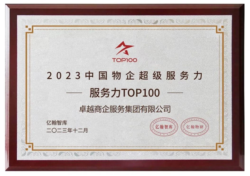 2023年12月15日,由億翰智庫、億翰物研舉辦的「2023不動產(chǎn)行業(yè)高質量發(fā)展峰會暨超級產(chǎn)品力&服務力年度大會」在上海隆重召開?!?023中國物業(yè)企業(yè)服務力研究」聚焦物業(yè)企業(yè)核心服務力,圍繞企業(yè)服務運營能力、服務粘性體系、服務標準體系三大板塊,包含10個二級指標、30余項三級指標,系統(tǒng)、全面地對物業(yè)企業(yè)服務力展開詳細研究。會上重磅發(fā)布了《2023中國物企超級服務力TOP100研究成果》等一系列研究成果,卓越商企服務集團作為中國領先的商務物業(yè)管理服務提供商榮獲「2023中國物企超級服務力百強」、「2023年物業(yè)服務雇主品牌影響力領先企業(yè)」、「2023中國產(chǎn)業(yè)園區(qū)輕資產(chǎn)運營服務力領先企業(yè)」、「2023中國物業(yè)服務華南服務力領先企業(yè)」、「2023中國物業(yè)服務深圳市服務力優(yōu)質企業(yè)」、「2023中國IFM創(chuàng)新服務力領先企業(yè)-深圳市卓品商務服務有限公司」、「2023中國商業(yè)物業(yè)服務標桿項目-深圳卓越城共七大獎項。