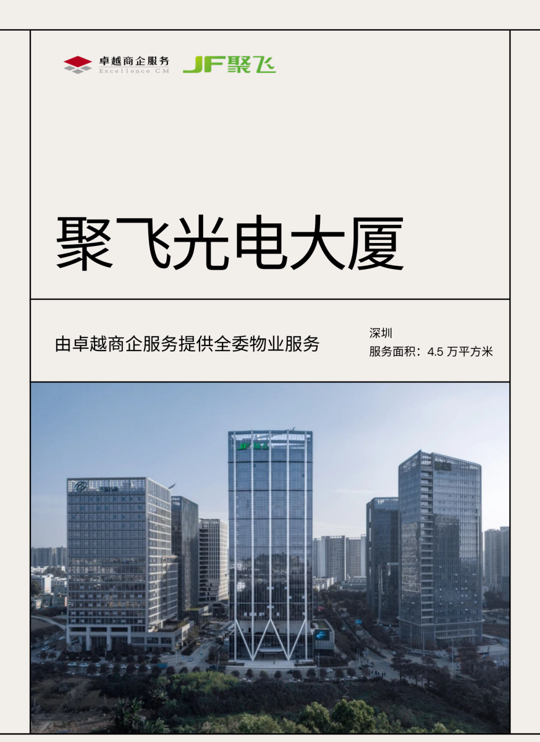 近日,憑借對(duì)商務(wù)不動(dòng)產(chǎn)服務(wù)和對(duì)聚飛光電需求的精準(zhǔn)理解,卓越商企服務(wù)獲得深圳市聚飛光電股份有限公司的信任和委托,全面承接聚飛光電大廈,與其達(dá)成合作,提供設(shè)施設(shè)備運(yùn)維、客戶服務(wù)、安保管理、能源管理等全生命周期物業(yè)運(yùn)維服務(wù),總服務(wù)面積約4.5萬(wàn)平方米。