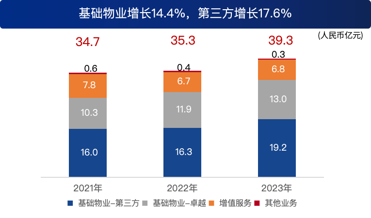 2023年,卓越商企服務(wù)通過主動(dòng)壓降關(guān)聯(lián)方的業(yè)務(wù)規(guī)模提升了獨(dú)立性。從營收占比來看,公司對(duì)關(guān)聯(lián)方的依賴度也明顯下降?;A(chǔ)物業(yè)收入同比增長14.4%,增速提升7.4%,其中,公司第三方基礎(chǔ)物業(yè)2023年增長約2.9億,較2022年多增2.6億?;颈P持續(xù)實(shí)現(xiàn)較快擴(kuò)張,這也為業(yè)主增值服務(wù)的增長奠定了良好的基礎(chǔ)。