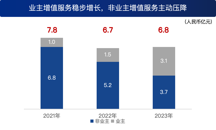 2023年,公司在業(yè)主增值服務(wù)錄得良好的增勢。業(yè)主增值服務(wù)作為增值服務(wù)的主要收入增長點(diǎn),同比大幅增長105%,非業(yè)主增值服務(wù)主動(dòng)壓降,收入同比下降29.0%。伴隨基礎(chǔ)物業(yè)外延增長的同時(shí)進(jìn)一步提升滲透率,業(yè)主增值服務(wù)在增值服務(wù)收入中的占比顯著提升23個(gè)百分點(diǎn)至46%”