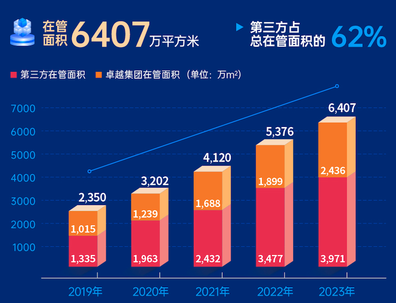 2023年,卓越商企服務(wù)持續(xù)夯實(shí)商務(wù)物業(yè)核心優(yōu)勢,積極展開多業(yè)態(tài)布局、拓展新賽道,尤其是圍繞具備高價(jià)值高潛力的物管領(lǐng)域展開布局,同時(shí)提升自身外拓能力,增強(qiáng)業(yè)務(wù)獨(dú)立性。截止2023年底,公司在管面積中,第三方在管面積占比達(dá)到了62%。與此同時(shí),非住宅物業(yè)在管面積則達(dá)到了61%。