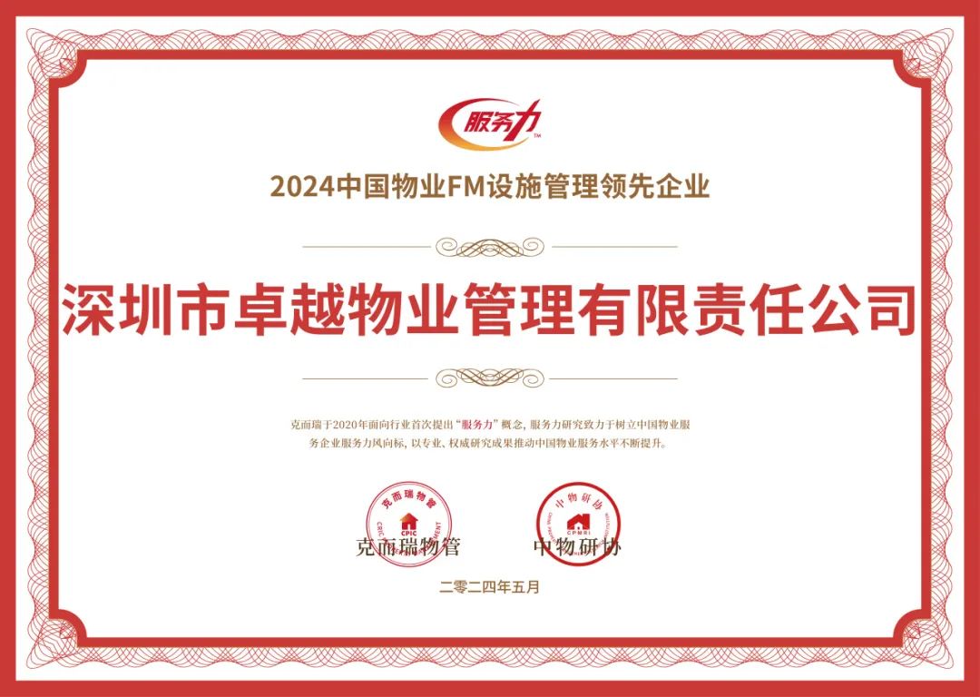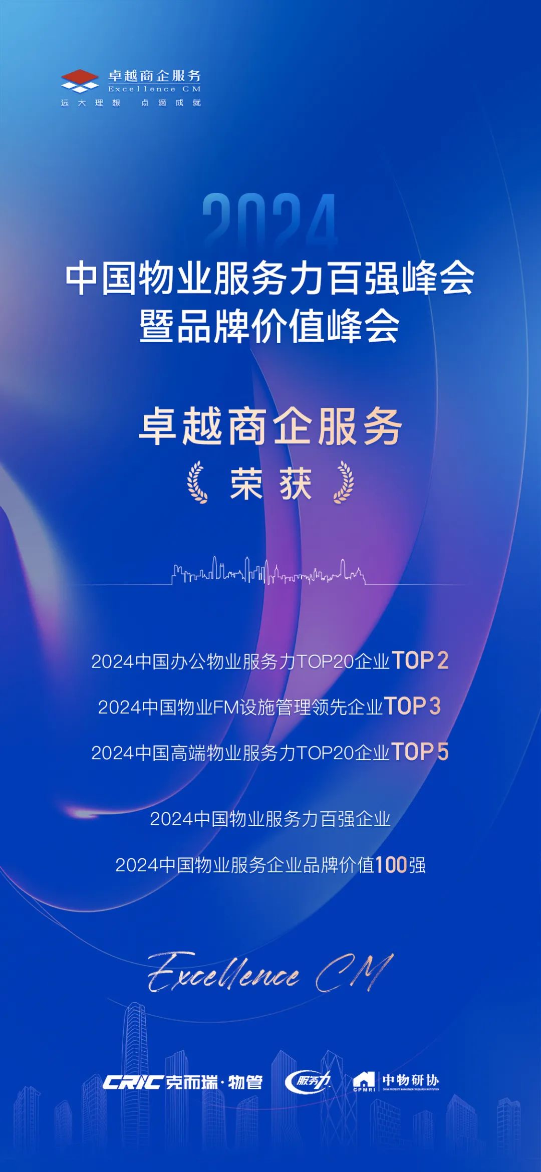 2024年5月17日,由克而瑞物管&中物研協(xié)主辦、安徽省社區(qū)服務業(yè)協(xié)會協(xié)辦的「2024中國物業(yè)服務力百強峰會暨品牌價值峰會」在合肥隆重舉辦。卓越商企服務集團作為中國領(lǐng)先的商務物業(yè)管理服務提供商,憑借在高端商務物業(yè)的領(lǐng)先優(yōu)勢和IFM業(yè)務領(lǐng)域的先行優(yōu)勢,被克而瑞物管&中物研協(xié)評為「2024中國辦公物業(yè)服務力TOP20企業(yè)(TOP2)」、「2024中國物業(yè)FM設(shè)施管理領(lǐng)先企業(yè)(TOP3)」、「2024中國高端物業(yè)服務力TOP20企業(yè)(TOP5)」等物業(yè)細分賽道領(lǐng)先獎項。