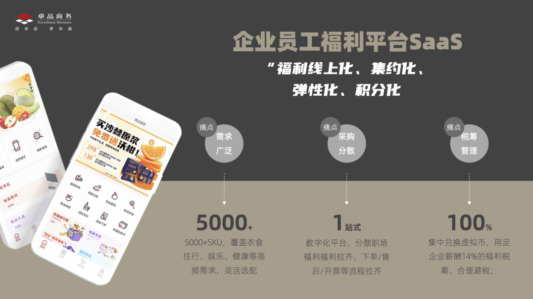 例如,卓越商企服務(wù)旗下卓品商務(wù)打造的員工福利的SaaS化平臺將企業(yè)幾千名員工的彈性、個性化需求全部上架到我們福利平臺之上,通過這樣的方式,員工可以自主的、更加具有個性化的、更能滿足自己喜好地選擇員工想要的東西,通過這樣的方式去完成整個公司對于薪酬福利化的指標,同時又能夠提高員工的滿意度。