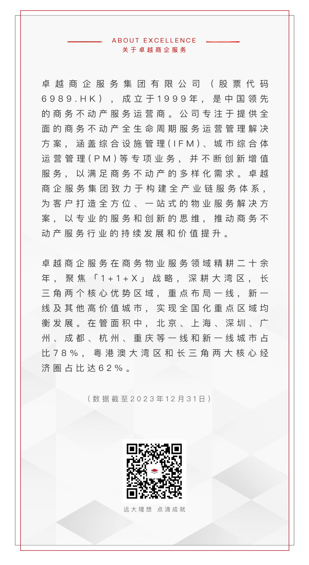 他與卓越商企服務(wù)的結(jié)緣水到渠成。從成立之初,卓越商企服務(wù)便確立了以“成為領(lǐng)先的商務(wù)不動產(chǎn)服務(wù)運(yùn)營商”為愿景。眾多互聯(lián)網(wǎng)高科技大廠的總部和大型產(chǎn)業(yè)園區(qū),都由卓越商企服務(wù)提供服務(wù)。