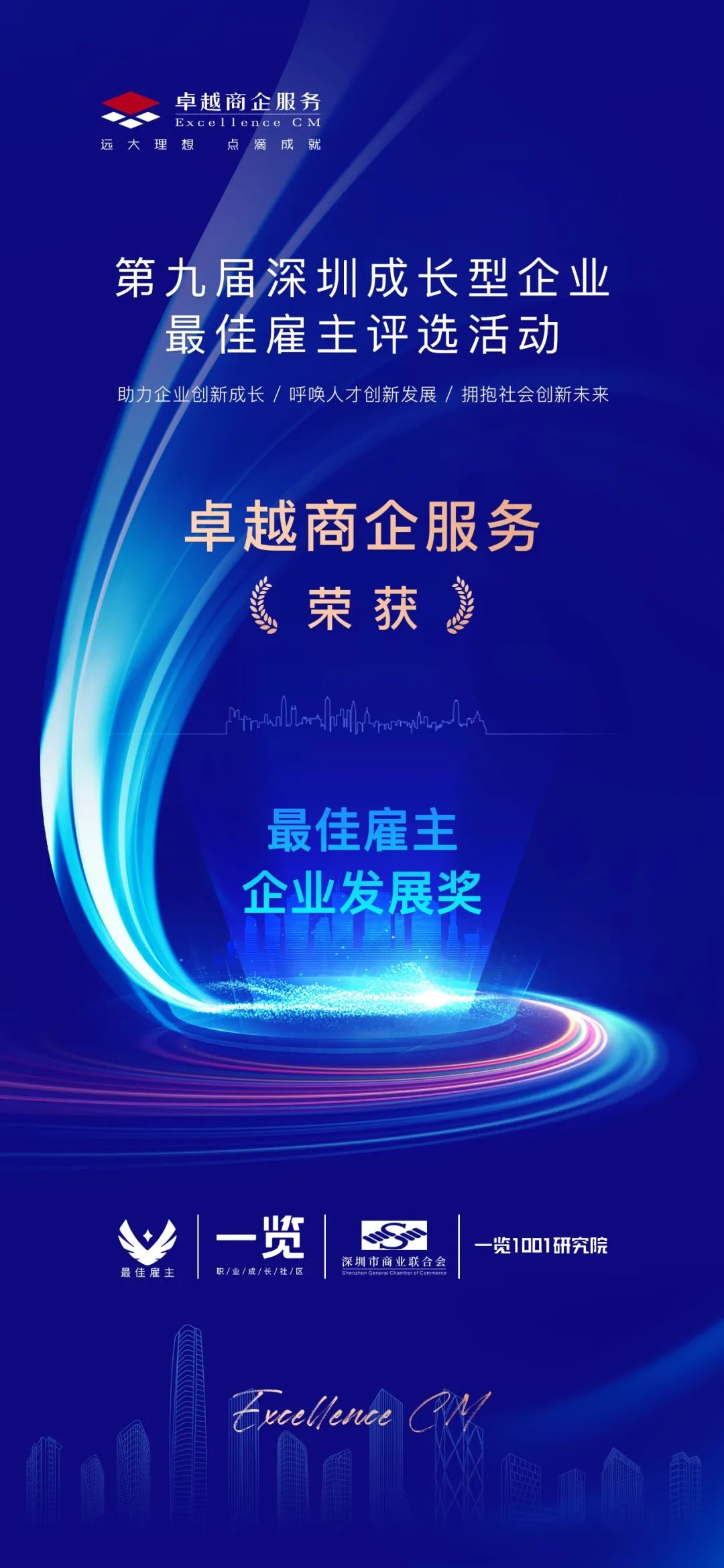 2023年5月11日,由深圳市商業(yè)聯(lián)合會(huì)主辦的「第九屆深圳成長型企業(yè)最佳雇主頒獎(jiǎng)典禮」在深圳南山圓滿舉行,會(huì)上公布了「第九屆深圳成長型企業(yè)最佳雇主評(píng)選活動(dòng)獲獎(jiǎng)榜單」,卓越商企服務(wù)憑借在人力資源戰(zhàn)略、人才發(fā)展、ESG發(fā)展、組織創(chuàng)新等方面做出的卓越表現(xiàn),榮獲「最佳雇主-企業(yè)發(fā)展獎(jiǎng)」。作為中國商務(wù)物業(yè)服務(wù)行業(yè)的頭部企業(yè),卓越商企服務(wù)一直將雇主品牌的建設(shè)和發(fā)展作為企業(yè)戰(zhàn)略方針,夯實(shí)人才根基,為員工創(chuàng)造更全面和立體的成長環(huán)境,推動(dòng)企業(yè)長遠(yuǎn)發(fā)展。