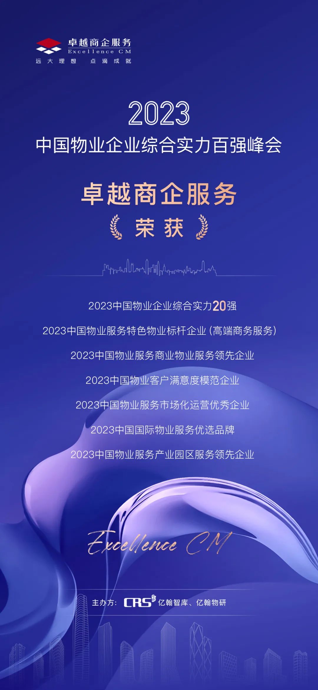 8月4日,由億翰智庫、億翰物研主辦的「長坡厚雪·久久為功——2023中國物業(yè)企業(yè)綜合實力百強(qiáng)峰會」在超級聯(lián)展博覽會現(xiàn)場隆重舉行。來自全國各地近100家物業(yè)企業(yè)大咖嘉賓、物業(yè)行業(yè)專家以及上下游供應(yīng)鏈企業(yè)領(lǐng)導(dǎo)參會,會上重磅發(fā)布《2023中國物業(yè)企業(yè)綜合實力研究成果》等一系列研究成果。卓越商企服務(wù)集團(tuán)作為中國領(lǐng)先的商務(wù)物業(yè)管理服務(wù)提供商,憑借領(lǐng)先的綜合實力和服務(wù)水平,被評為「2023中國物業(yè)服務(wù)商業(yè)物業(yè)服務(wù)領(lǐng)先企業(yè)」、「2023中國物業(yè)服務(wù)特色物業(yè)標(biāo)桿企業(yè)(高端商務(wù)服務(wù))」、「2023中國物業(yè)客戶滿意度模范企業(yè)」、「2023中國物業(yè)服務(wù)市場化運(yùn)營優(yōu)秀企業(yè)」、「2023中國物業(yè)服務(wù)產(chǎn)業(yè)園區(qū)服務(wù)領(lǐng)先企業(yè)」和「2023中國國際物業(yè)服務(wù)優(yōu)選品牌」。