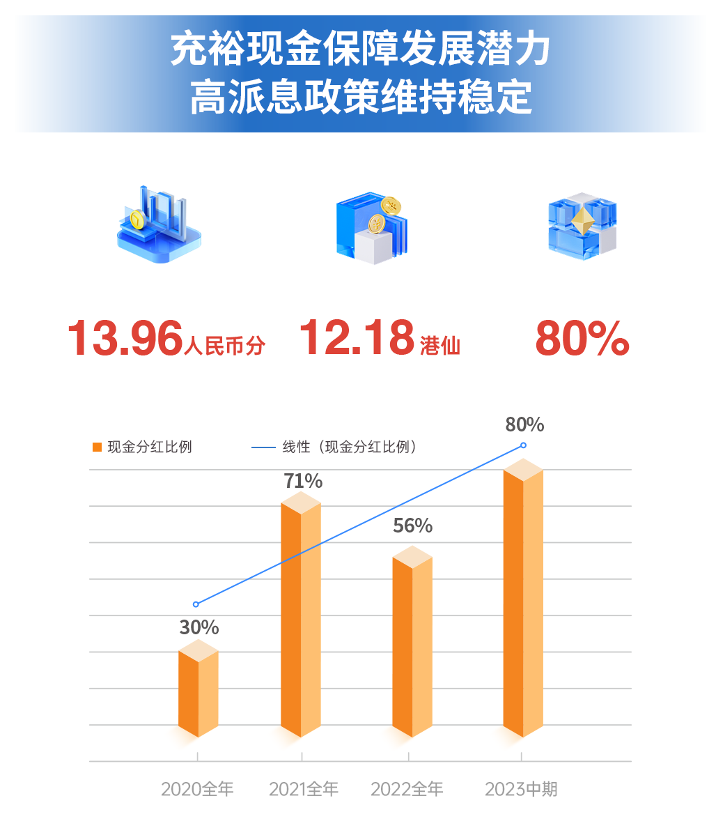 高派息一直以來是卓越商企服務(wù)樹立的資本市場形象,自上市以來,公司年度現(xiàn)金分紅比率基本維持在55%以上。截至2023中期末,公司保有25億充裕的現(xiàn)金,基于目前公司現(xiàn)金的健康狀況,以及對股東和投資者的感恩回饋,2023年上半年,公司擬派息80%,每股派息12.18港仙,年化的股息回報率超8%,在行業(yè)中繼續(xù)保持領(lǐng)先,繼續(xù)鞏固在資本市場的良好形象。